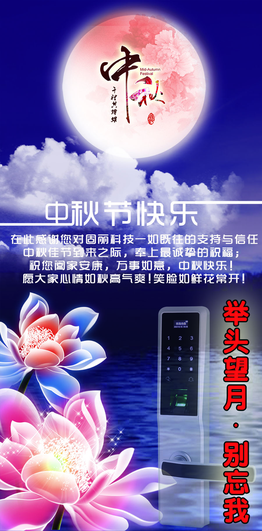 尊敬的客戶:感謝您對(duì)固麗科技長(zhǎng)期以來的支持和厚愛,月到中秋分外明,又是一年團(tuán)圓日。在這中秋月圓之際,在這親朋團(tuán)圓之日,我公司為您送上誠(chéng)摯的祝福,祝您身體健康,事業(yè)興旺,笑臉相伴,生意興隆,中秋月圓,美夢(mèng)成真!祝您及您的家人中秋快樂,幸福美滿!