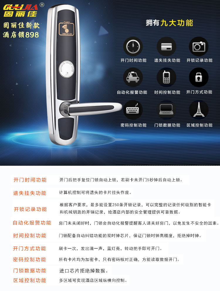 廣州錦盛商務(wù)酒店此次與我們固麗科技合作安裝了固麗佳GLJ-898FS的新款智能電子酒店門鎖,此款酒店鎖對(duì)每個(gè)細(xì)節(jié)精益求精,在莊嚴(yán)氣派中追求奢華優(yōu)雅,而融入現(xiàn)代設(shè)計(jì)手法后,則更貼近于實(shí)用性。其豪華的氣質(zhì)更是奢華與尊貴的象征,是各大星級(jí)酒店賓館首選。固麗佳酒店鎖可靠的質(zhì)量與完善的售后服務(wù)是各大酒店安裝智能門鎖的首要選擇。